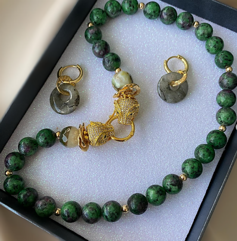 «AMAZONIA» Semi-Fine Natural Stone And Chain Choker Necklace With Earrings Luxury Jewellery Set⠀