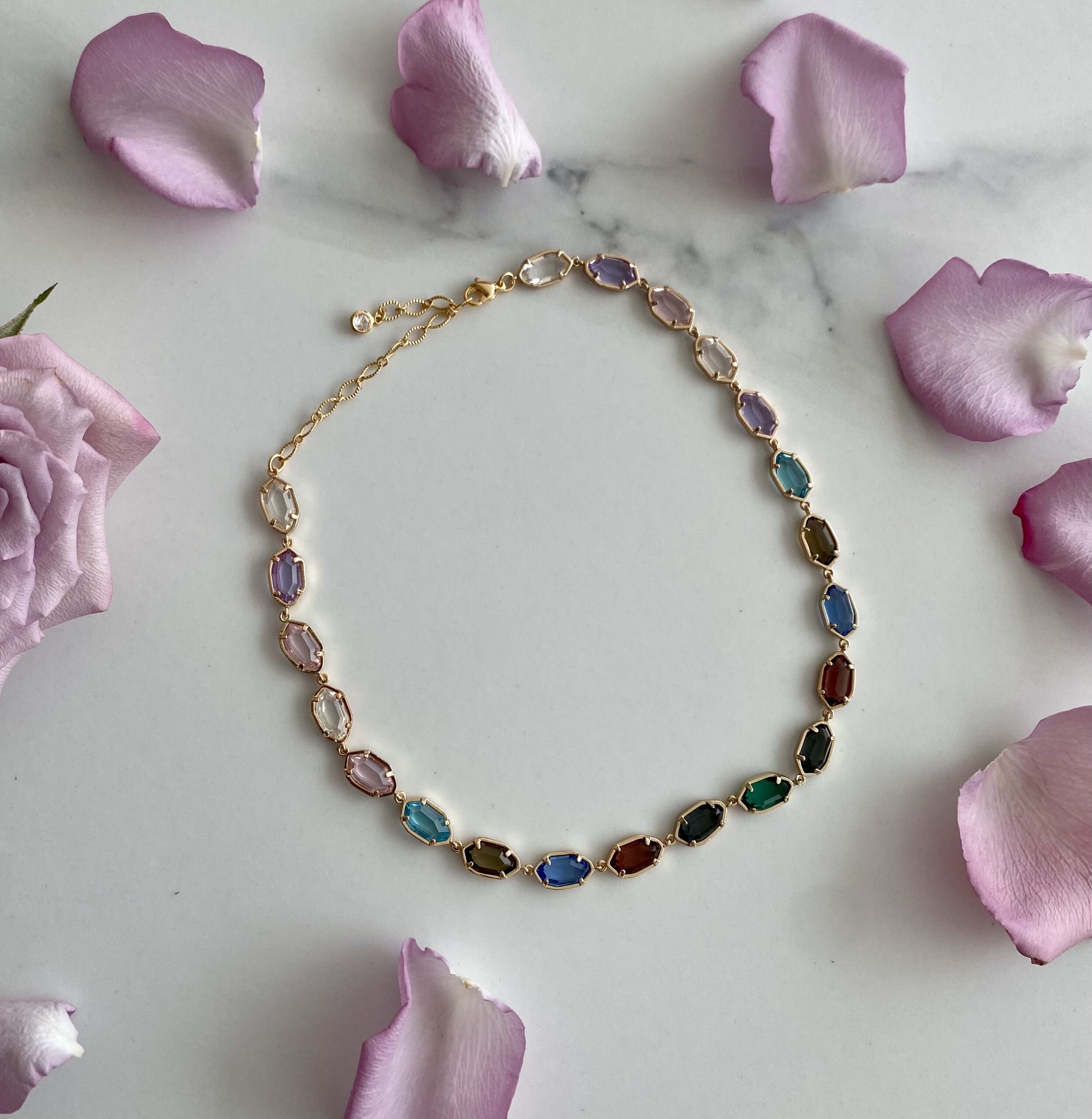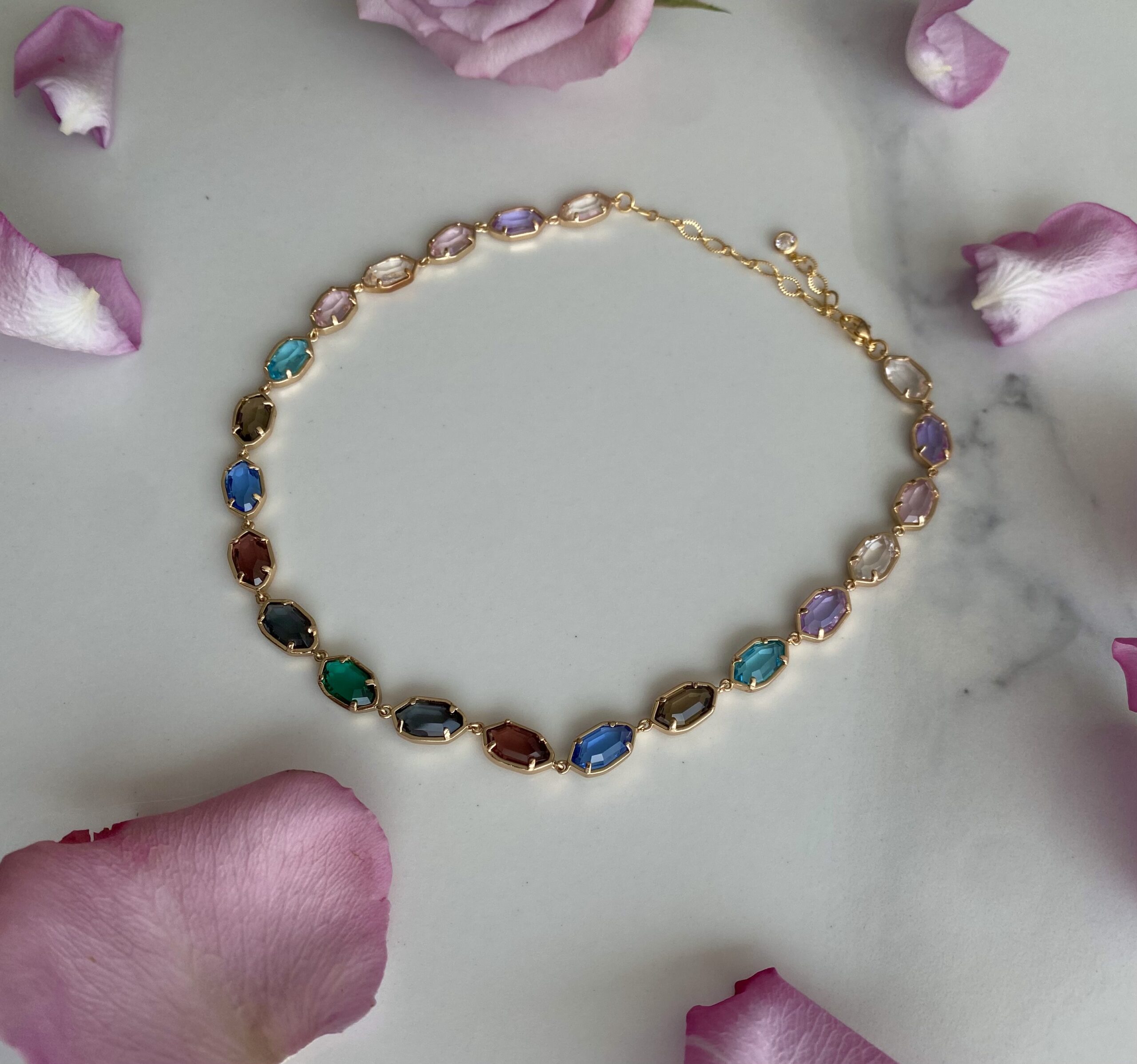 Each “DAINTY CRYSTALS” Choker Necklace begins its journey in the hands of skilled artisans, who meticulously set each colorful crystal glass piece into its copper bed. The vibrant stones are chosen for their clarity and color, reflecting the spectrum of a prism caught in a dance with light. These crystals are not just set; they are woven into a narrative of elegance, culminating in a piece that is as much a work of art as it is an accessory.